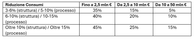 Le aliquote del credito variano in base alla riduzione dei consumi e alla quota d’investimento, secondo i seguenti parametri:
